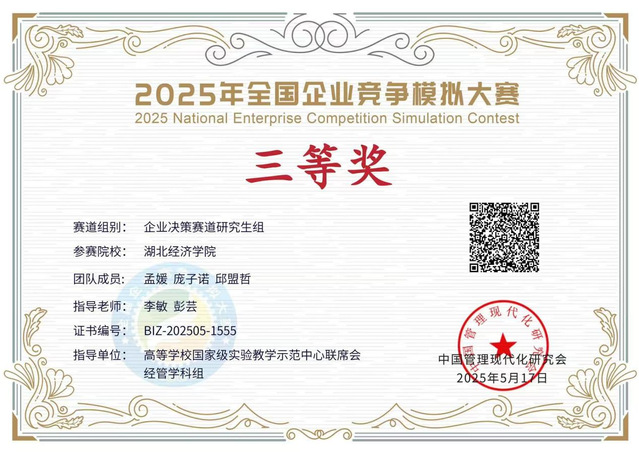 5月17日-18日,2025年全国企业竞争模拟大赛总决赛在西南财经大学举行。由我院研究生孟媛、庞子诺、邱盟哲组成的“金牌战队”在比赛中表现优异,荣获企业决策赛道的国家级三等奖。我院李敏老师和彭芸老师担任该队伍指导老师。