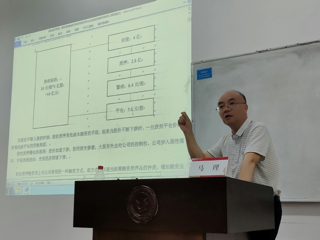 讲座伊始,马理教授首先简要介绍自身主要研究经历和聚焦“货币政策与宏观调控”研究领域的主要研究成果。紧接着,他以科研团队在研成果“股权质押融资业务风险与企业融资保障”为切入点,以案例交流的形式讲述了“如何选取研究主题”、“如何进行研究分析”、“如何凝练撰写研究成果”等方面的研究心得和体会。期间,他围绕这一主题与我院研究生分享其在研究范式、研究思路、实证方法选择等方面的思考和建议,在详细讲解后提出现阶段我国上市公司股权融资应以“降风险、稳增长”作为双目标的观点。