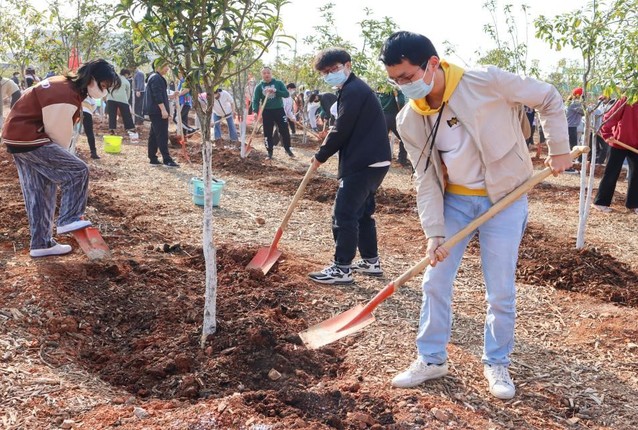 我院学生代表由团委老师赵坤明带队,每人手拿工具进入指定区域投入植树工作。活动中,大家按照填埋和浇灌两个流程进行分工,秩序井然,配合默契,全力栽种好每棵树苗。一把把铁锹在风中有力地飞舞,汗珠滴落在脚下充满生机的热土上,现场一片热火朝天,一个个矫健的劳动身影绘成了一幅助力绿色校园建设的美好画卷。