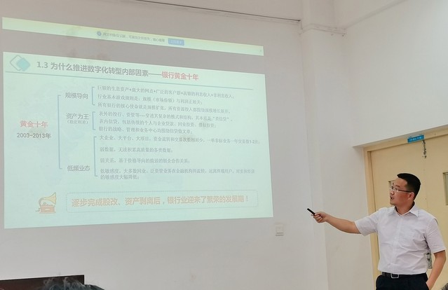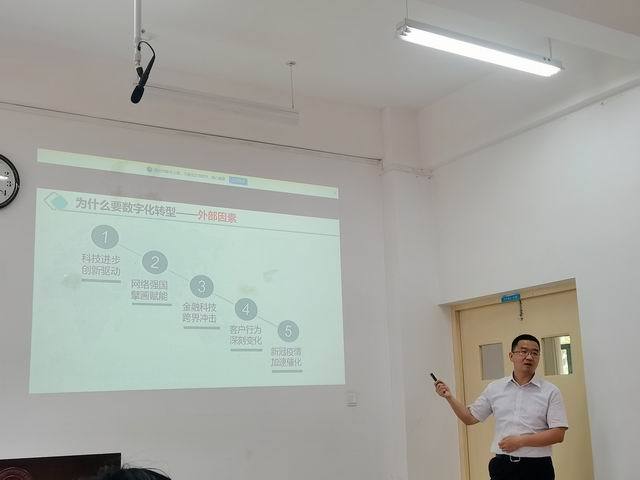 授课的主题是“银行数字化转型探究与实践”。陈老师以个人经历引入,从商业银行为什么推荐数字化转型、银行数字化的目标、金融行业数字化转型战略、农行数字化的实践四方面讲解,深入分析了商业银行数字化转型的必要性与重要性。在两个多小时的讲解中,陈老师结合现实典型案例,生动形象地介绍了商业银行数字化转型的方向与发展路径,同学们进一步了解了数字经济的发展现状,以及金融科技在绿色金融、普惠金融业务中的广泛应用,收获颇丰。