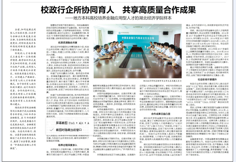共同建设综合性实习与就业基地。这是提升应用型人才就业质量的抓手。学校与协同单位共建了18家综合性实习与就业基地,仅农行湖北省分行每年就容纳近百名学生进行专业实习,接收数10名毕业生就业。