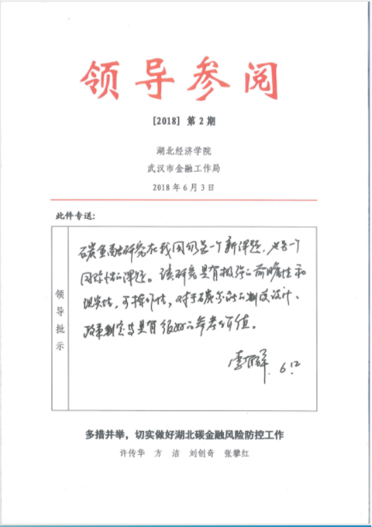 2018年6月12日,我校许传华教授主持完成的《多措并举,切实做好湖北碳金融风险防控工作》的研究成果获得了武汉市人民政府副市长李有祥的重要批示,批示指出:“该研究具有极强的前瞻性和现实性、可操作性,对于碳金融的制度设计、政策制定等具有很好的参考价值”。