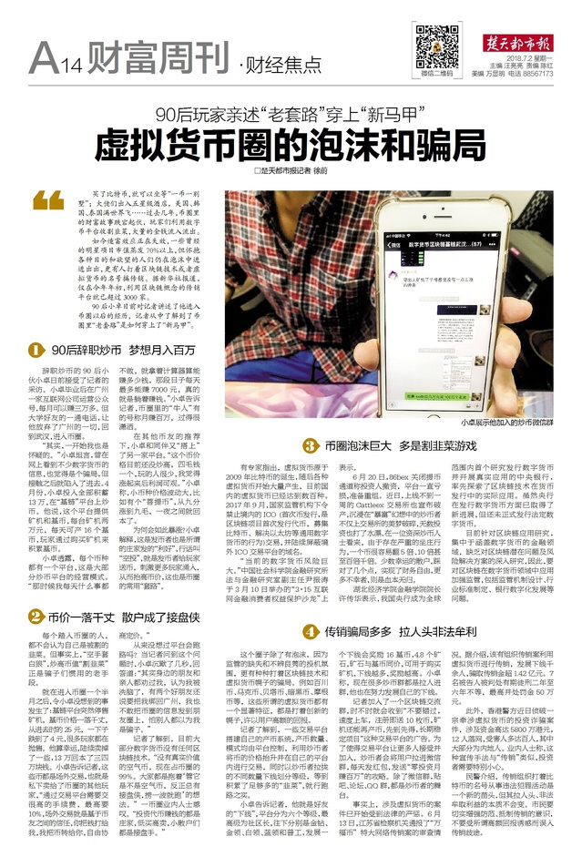 2018年7月2日,楚天都市报财富周刊深度聚焦“虚拟货币圈的泡沫和骗局“。在财经报道中,记者采访了我院院长许传华教授。