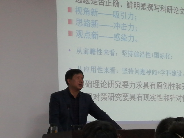 关于科研选题。他认为,科研选题大致来自于社会需要与内心感悟两个层面,二者整合产生的选题既有高社会效应,又具有个性化。他强调,在科研选题时,立意要新,价值要大,操作要易;从前瞻性来看,要坚持前沿性+国际化;从应用性来看,要坚持问题导向+学科建设。